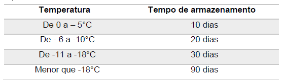 *Considerar a tabela abaixo para validade das marmitas conforme a temperatura do seu freezer. Cuidado! O congelamento não garante qualidade eterna da preparação. Se a data de vencimento chegar antes de consumir a marmita, jogue-a fora para segurança da sua saúde.