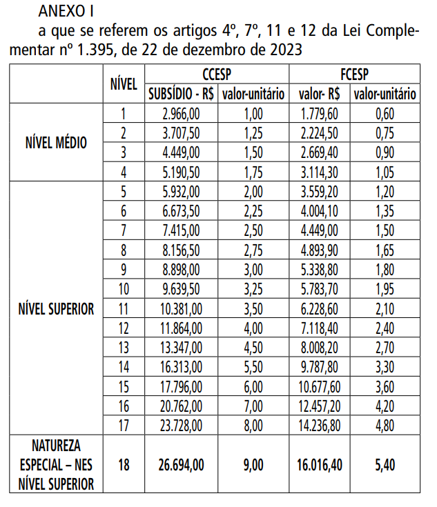 A Lei Complementar nº 1.395/2023, de 22 de dezembro de 2023 instituiu o Quadro Geral de Cargos em Comissão e Funções de Confiança (QGCFC), composto pelos Cargos em Comissão do Estado de São Paulo (CCESP) e pelas Funções de Confiança do Estado de São Paulo (FCESP), destinados às atividades de direção, chefia e assessoramento no âmbito da Administração Pública direta e das autarquias.