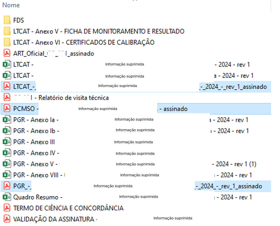 Os documentos básicos estão destacados na Figura 5. Para consulta ou controle de alguma ação de trabalho, deve-se partir desses documentos principais (LTCAT, PCMSO ou PGR), conforme a função de cada um. Os demais arquivos são anexos ou documentos de apoio. Caso todos os anexos não estejam separados da forma indicada, verifique se estão inseridos no corpo do documento principal.