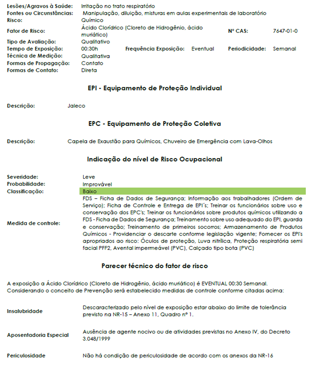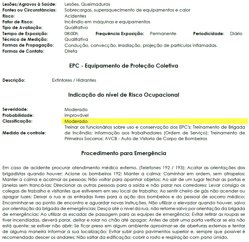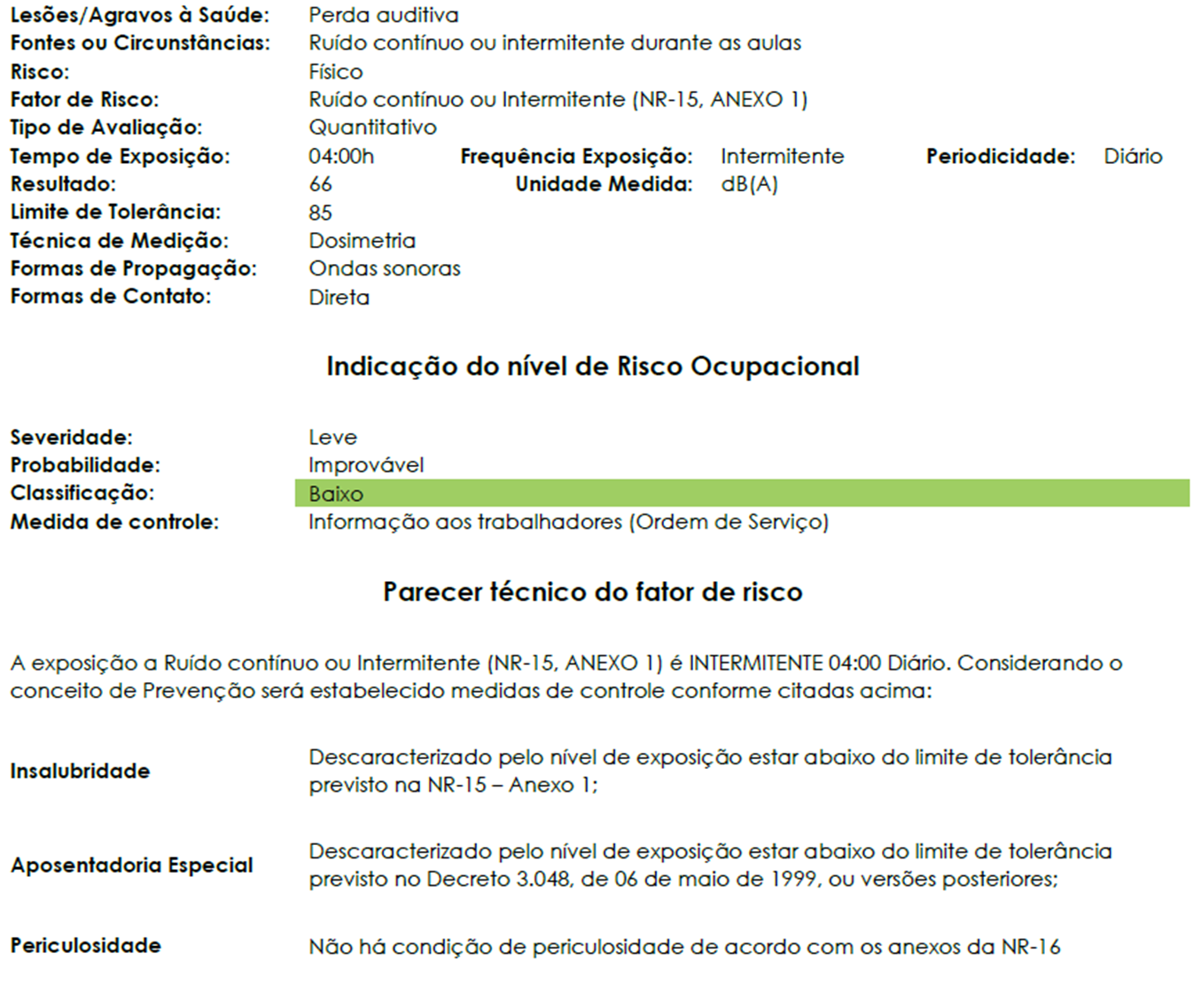 A seguir, apresenta-se um sumário resumido de um Laudo Técnico das Condições Ambientais do Trabalho (LTCAT) emitido pela Aclimed.