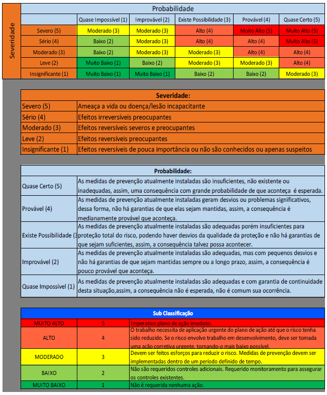 Para usar a matriz de riscos, o avaliador do risco deve julgar a severidade (o quão grave) e a probabilidade (chance de acontecer) do acidente. O julgamento é guiado pelas tabelas azul e laranja, conforme as cores apresentadas nos eixos (horizontal e vertical, respectivamente). O cruzamento das informações dos eixos horizontal e vertical resulta em cores (verde escura, verde clara, amarela, abóbora e vermelha) conforme a gradação do risco. A tabela de subclassificação traz as diretrizes das medidas de controle dos riscos.