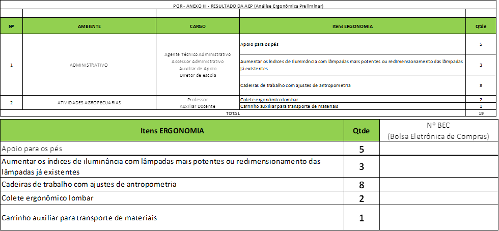 O Anexo III é a consolidação da AEP. Também antes era apresentada incorporada ao documento. Contudo, agora está em planilha à parte. Traz medidas e quantitativos para ergonomia física. Consulte sua área de gestão na Administração Central para encaminhar as necessidades. As Figuras 10 e 11 trazem exemplos de apresentação das planilhas da AEP.