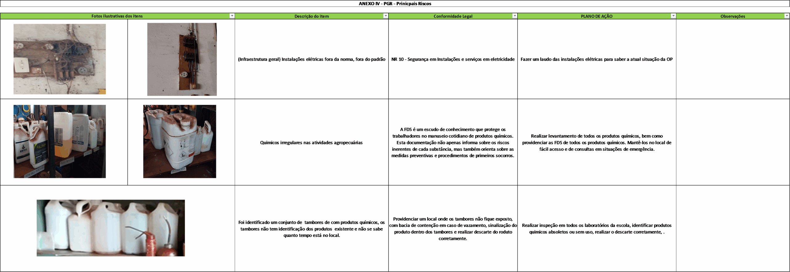 No Anexo IV do PGR estão os principais riscos detectados na unidade, é uma planilha apresentada à parte, também em formato de plano de ação. Segundo os técnicos que avaliaram a unidade, são os riscos mais propensos a causar acidentes. A Figura 12 demonstra um exemplo de Anexo IV do PGR.