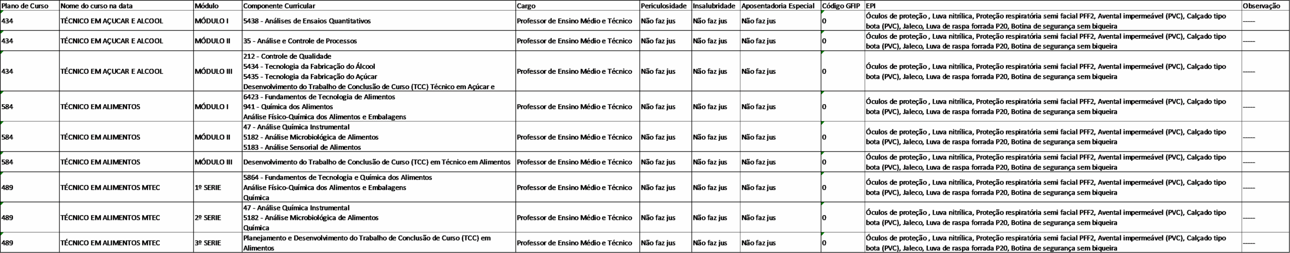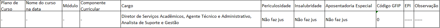 A atenção a ser dada é para a aba da planilha (aparece embaixo no Excel – no caso é a GES 04). As colunas trazem os códigos dos cursos, nomes dos cursos, os respectivos componentes curriculares, os cargos de cada grupo de componente, e os resultados (se faz jus a periculosidade, insalubridade e aposentadoria especial – nestas colunas, quando “faz jus”, vêm os respectivos percentuais do adicional).