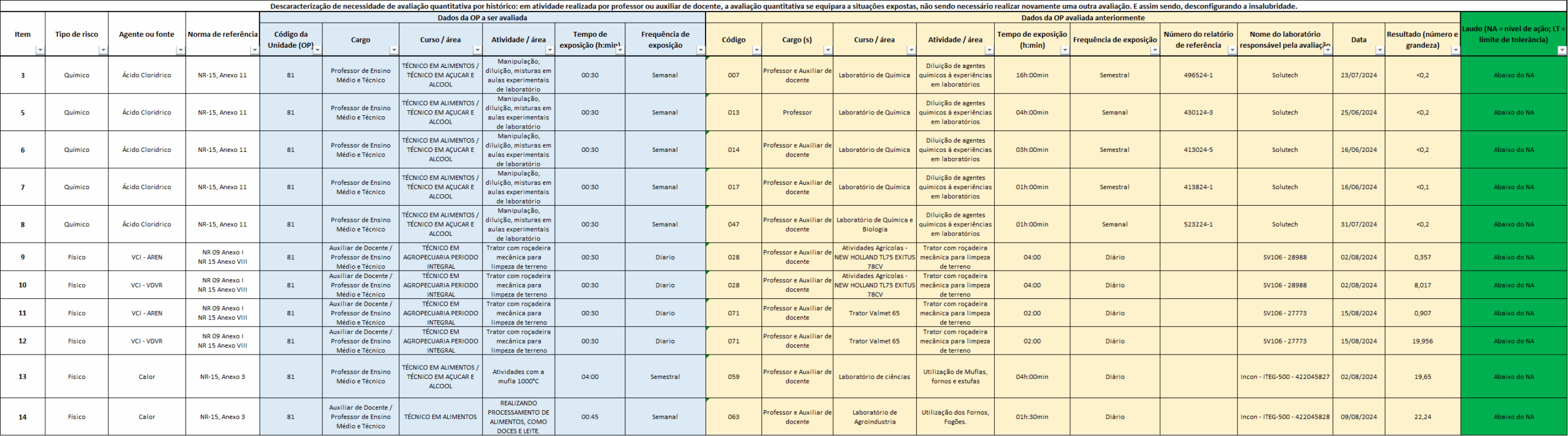 Estes relatórios indicam uma condição de insalubridade ou nível de ação. A condição de insalubridade, caso existente, é registrada no Anexo I do LTCAT. O nível de ação (a partir da metade da dose) é registrado pela DSMT. As tratativas são feitas com cada unidade, via mensagem por meio oficial de comunicação. O nível de ação obriga a unidade a tomar providências antes que se atinja o limite de tolerância.