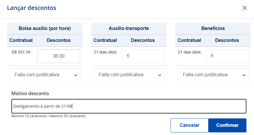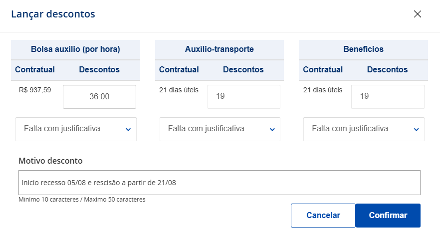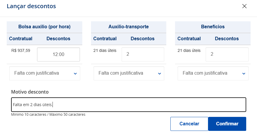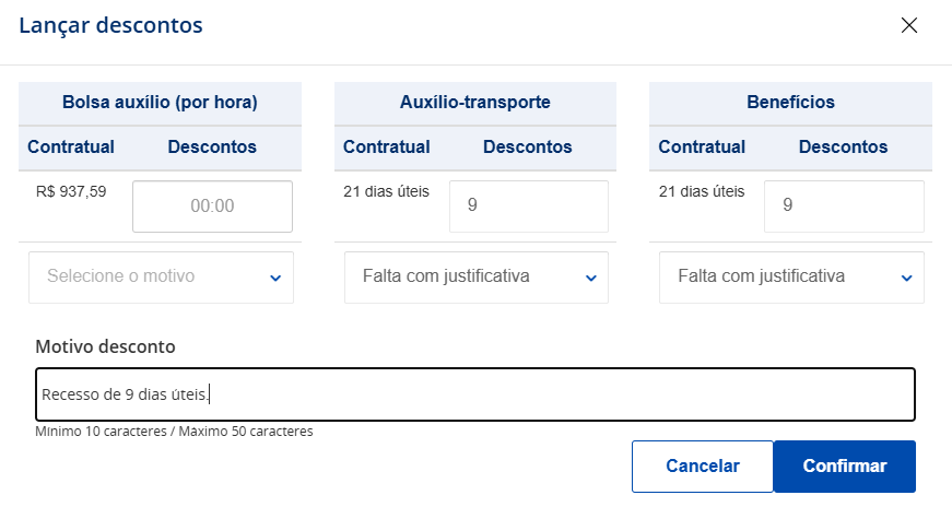 Em caso de desconto (por falta, recesso, desligamento, atraso ou início do exercício posterior ao primeiro dia útil do mês) informar os devidos descontos, conforme exemplos abaixo. Lembrando que a “bolsa-auxílio” é descontada em horas e o “auxílio-transporte” e “benefícios” são descontados em dias.