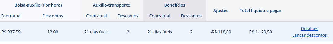 Neste caso, seriam 19 dias para descontar dos campos “auxílio-transporte” e “alimentação” (considerando os dias úteis a partir do início do recesso e até o término do mês, visto que houve o desligamento ao término do recesso) e no campo “bolsa-auxílio” somente os dias úteis após o desligamento, ou seja: