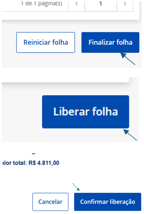 Ao clicar em “Lançar folha” e confirmar a mensagem que aparece na tela, caso não haja desconto a ser informado, deverá clicar em “Finalizar folha”, “Liberar folha” e “Confirmar liberação”. Desta forma a folha será devidamente finalizada sem descontos.