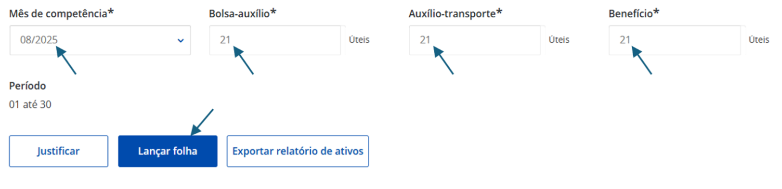 Por exemplo, considerando que o mês de agosto/2025 teve 21 dias úteis, deve-se selecionar “08/2025” em “Mês de competência”, alterar os campos “Bolsa-auxílio”, “Auxílio-transporte” e “Benefício” para “21”, e clicar em “Lançar folha”, conforme imagem abaixo: